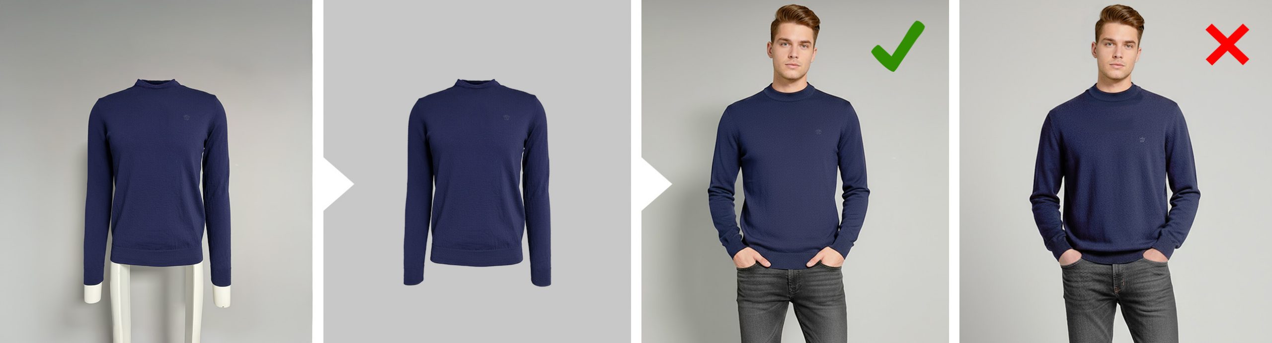 The garments sit exactly as they would on a real model, giving the AI perfect data to process – with natural folds, clean outlines, and accurate proportions.